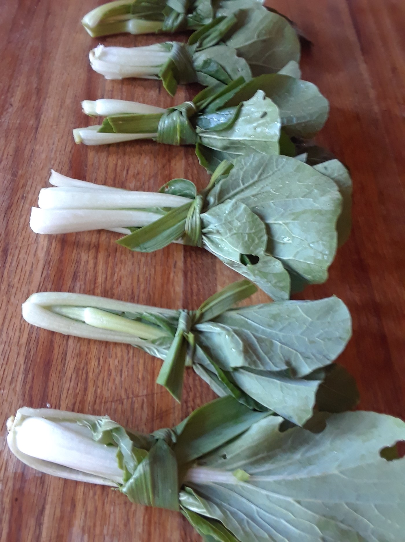 - Carefully tie garlic scapes around the middle of the pak choi bundles with single knots, just tight enough to stay tied.