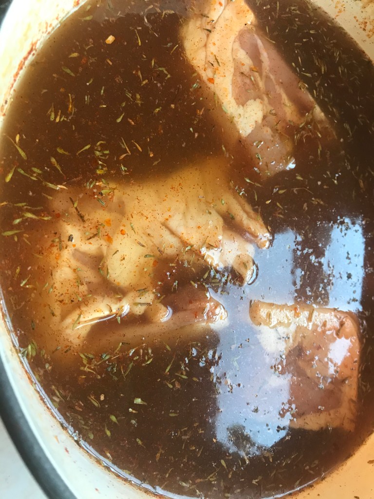 My smart significant other came up with this idea a few days ago as we were cleaning up after our annual peanut boiling/canning. We had already poured out much of the brine, when he stopped and asked, “Why don’t we use this brine for chicken?” It was the best idea he’s had all year. I immediately pulled a package of chicken quarters from the freezer.